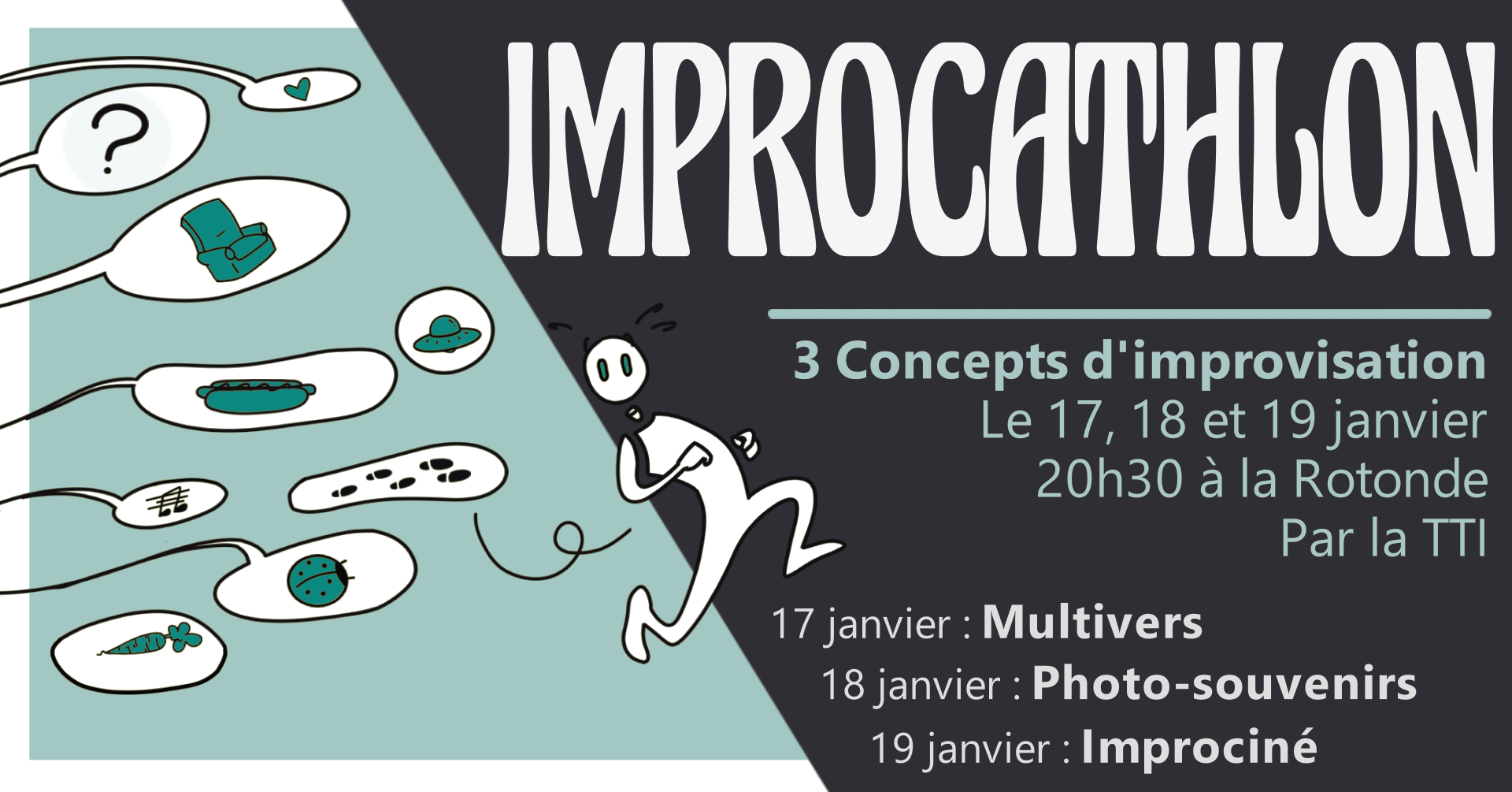 Alors save the dates, les 17, 18 et 19 janvier à 20h30 à la Rotonde pour un Multivers, une Photo-Souvenir et des Improciné. Si toi aussi ça t’intrigue réserve ta place sur helloasso ou sur place pour 1 euro de plus !